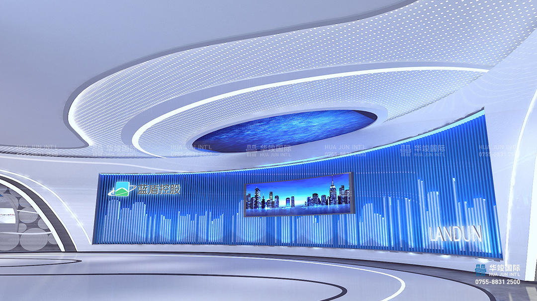 世界地圖的設(shè)計全面展示藍盾集團的業(yè)務(wù)分布,凸顯業(yè)務(wù)的全球化。側(cè)面的拼接屏展示,國家對科技行業(yè)的一個政策扶持。結(jié)合流程和特色展示創(chuàng)新科技成果,突出展示藍盾的技術(shù)優(yōu)勢,與雄厚的研發(fā)實力。藍盾學院模擬真實培訓場景,結(jié)合地面呈WiFi信號凳形狀,凸顯網(wǎng)絡(luò)安全重要性。