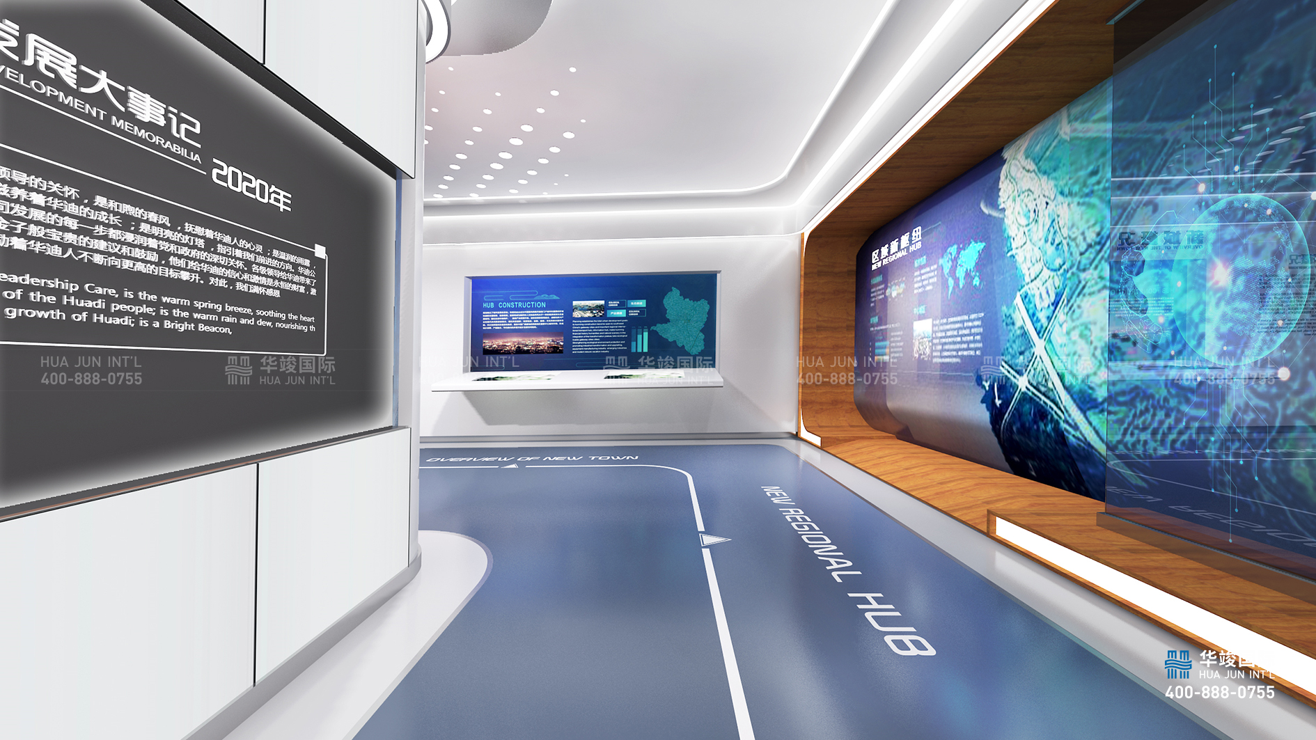 寶雞高新區城市館展廳設計項目由華竣數創執行整體設計施工。華竣國際以“智慧城市展廳”為起點,結合數字沙盤、數字影院、虛擬現實、互動多媒體等技術,打造承載城市歷史、展現城市現在、展望城市未來的智慧規劃館。