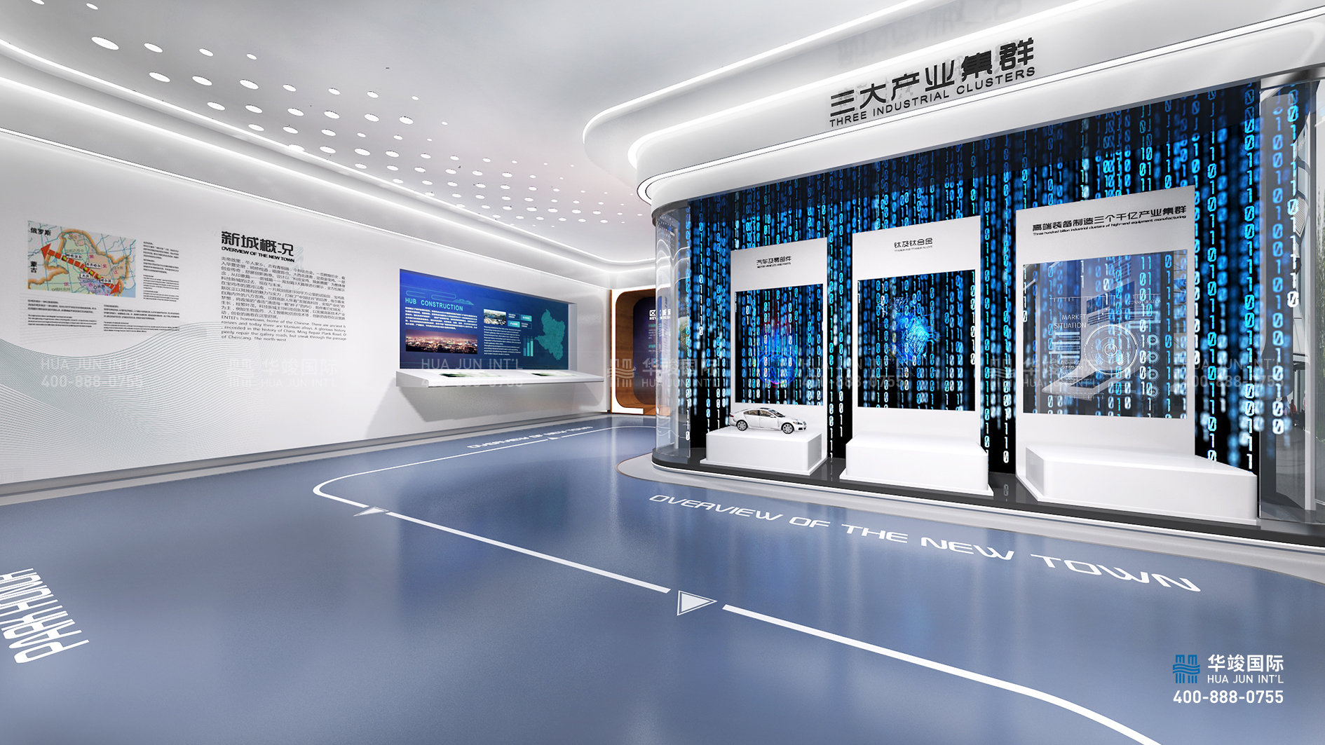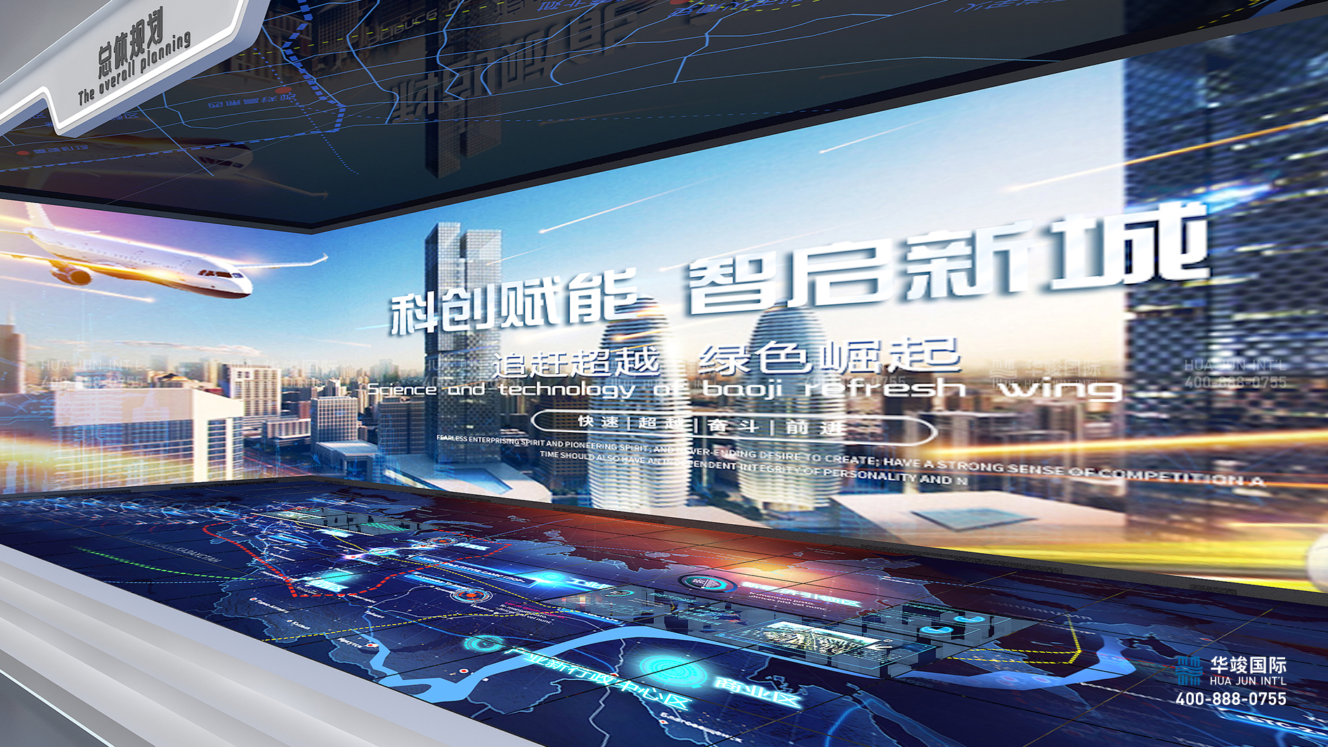 總體規劃主要內容為一心/兩軸/三組 團的總體規劃布局,利用沉浸式數字沙盤體驗數字科技感的空間氛圍,使參觀者身臨其境,切身融入到高新區科技新城的場景之中。
