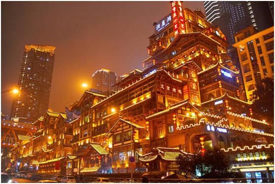 洪崖洞建筑群依山而建、沿江而立。載體本身用分層筑臺(tái)、吊腳、層疊等手法,搭建出一個(gè)極具立體感和層次感的建筑載體,配合江水、跨江大橋、現(xiàn)代化高樓的應(yīng)襯,為景觀照明設(shè)計(jì)創(chuàng)造出絕無(wú)僅有的優(yōu)質(zhì)先決條件,這樣的載重在體放大建筑本身的結(jié)構(gòu)美。現(xiàn)在的洪崖洞正是采用燈帶結(jié)合的方式,將燈光重點(diǎn)運(yùn)用在廊柱投射和輪廓勾勒上,墻身處使用泛光燈照亮整個(gè)樓宇外墻,輔助突出建筑輪廓。